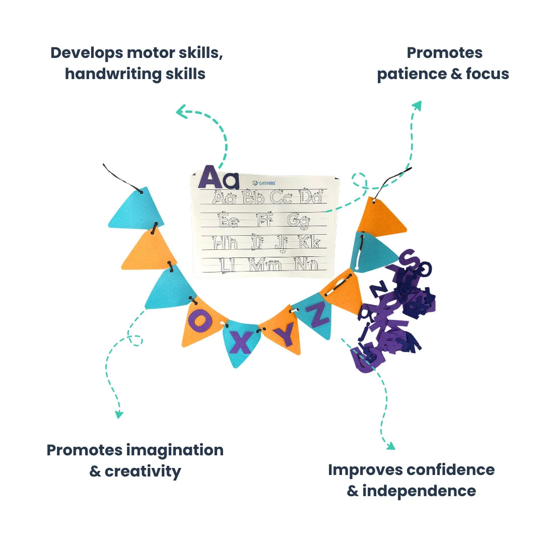 Explore letter shapes with a DIY banner and reusable alphabet practice sheets. It helps in building writing skills through letter-matching, tracing, and alphabet games, and craft out a special message to create a personal banner.