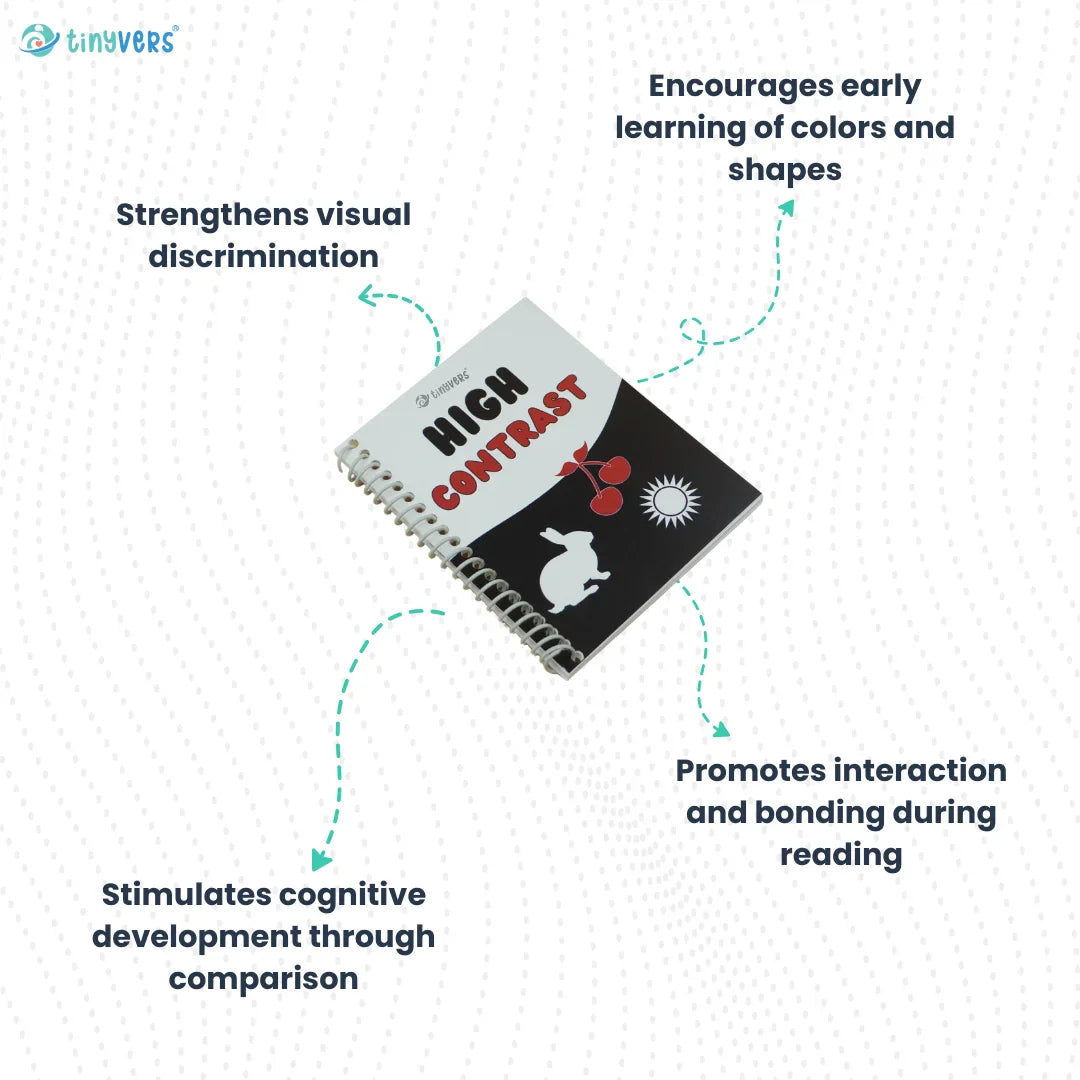 Explore visual adventure with "High Contrast Book ". This book has high-contrast images for your baby's visual developmental support and gives them an introduction to the most basic colors and shapes.
