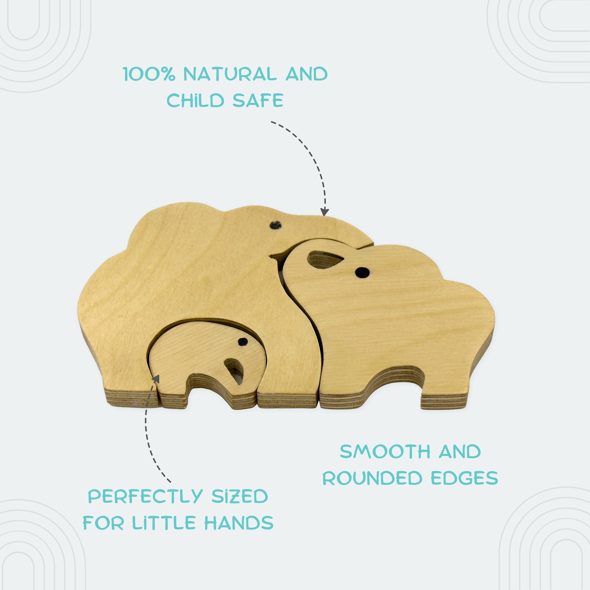 Watch as your child immerses themselves in imaginative play and crafting stories with this charming elephant family. Crafted from 100% natural and eco-friendly materials, this set includes three elephants that can be arranged together as a puzzle. Each elephant is expertly carved and coated with non-toxic paint, making them an excellent and safe choice for your child's playtime.