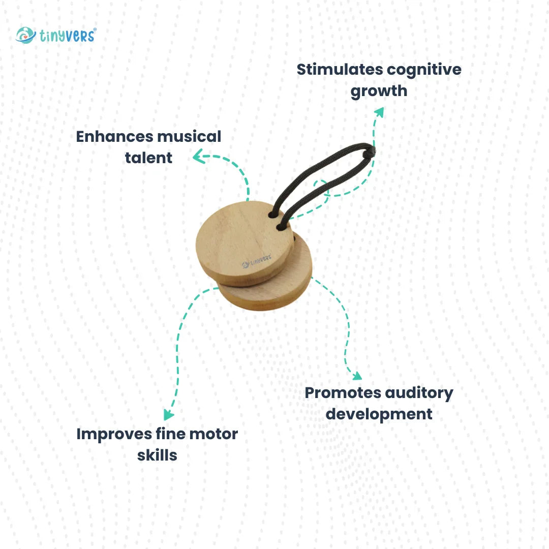 Introducing wooden castanet, made from natural wood, non-toxic materials and circular smooth edges that are as gentle as a baby's touch. Tap, shake, create melodies of joy together to enhance fine motor skills, creativity and musical exploration!