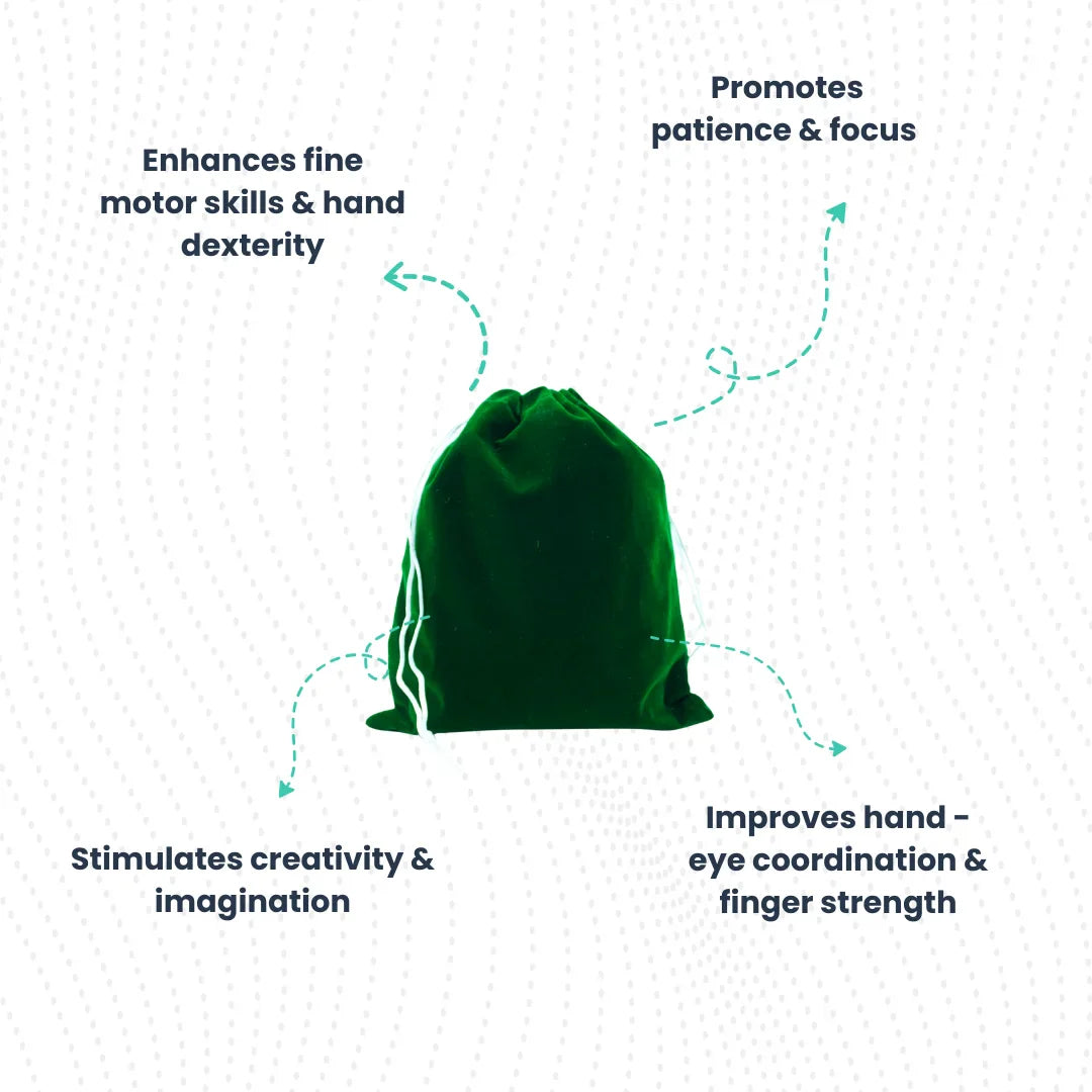 • As children place it into the bag and grab the objects, they can improve their coordination between their hands and eyes.