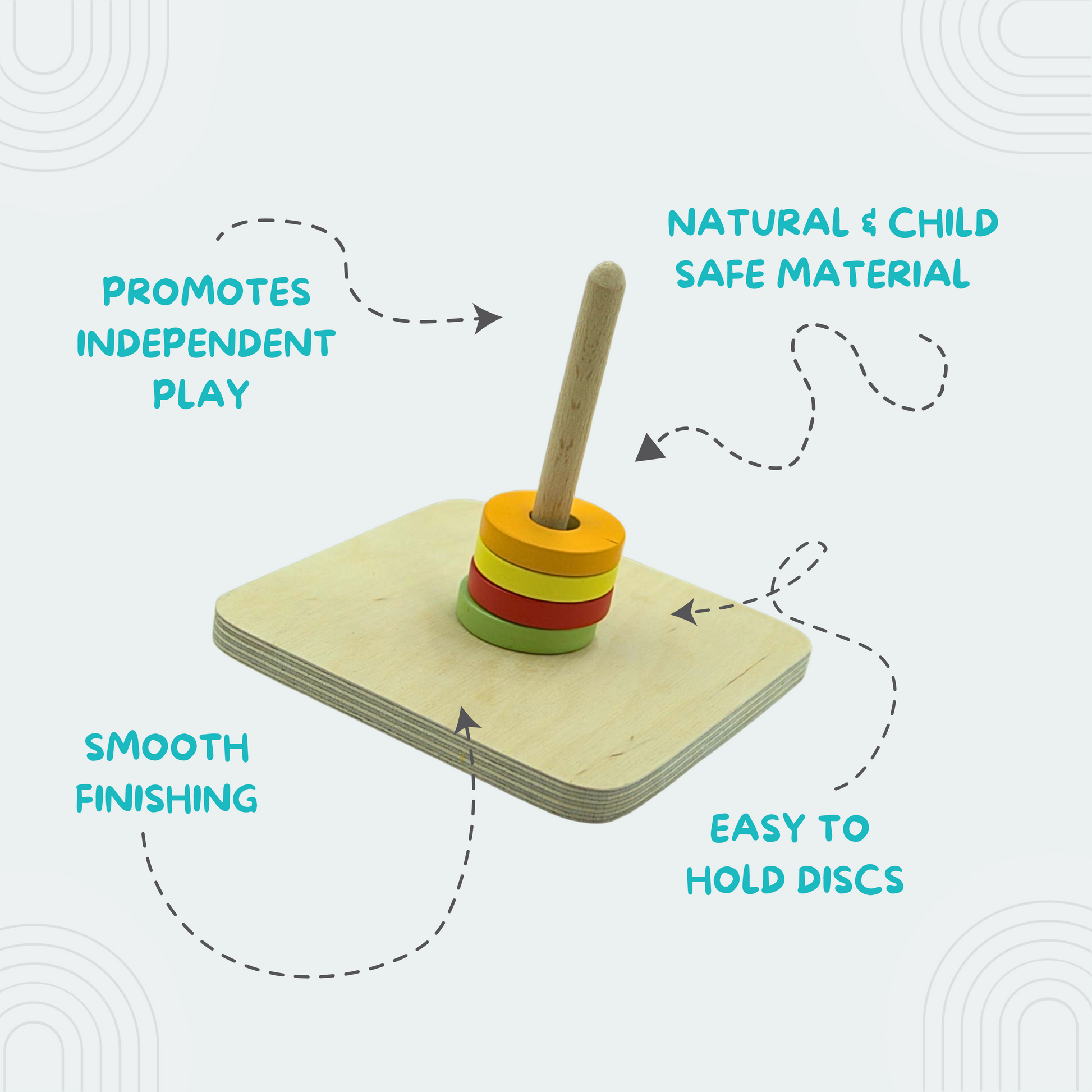 • As your child slides the colorful wooden discs on the staker, they will improve their hand-eye coordination and motor skills.