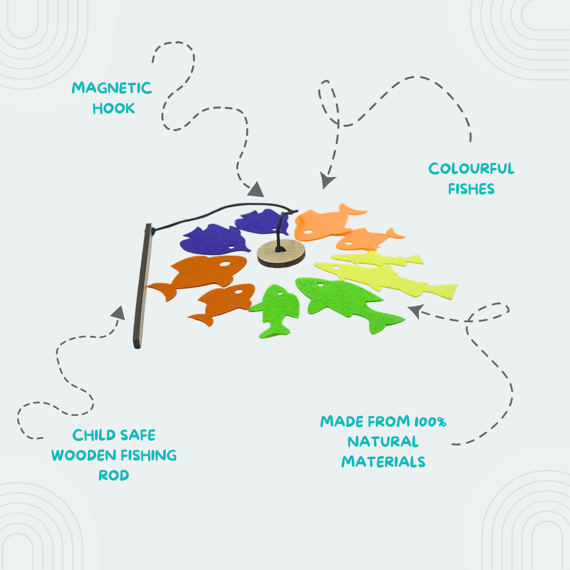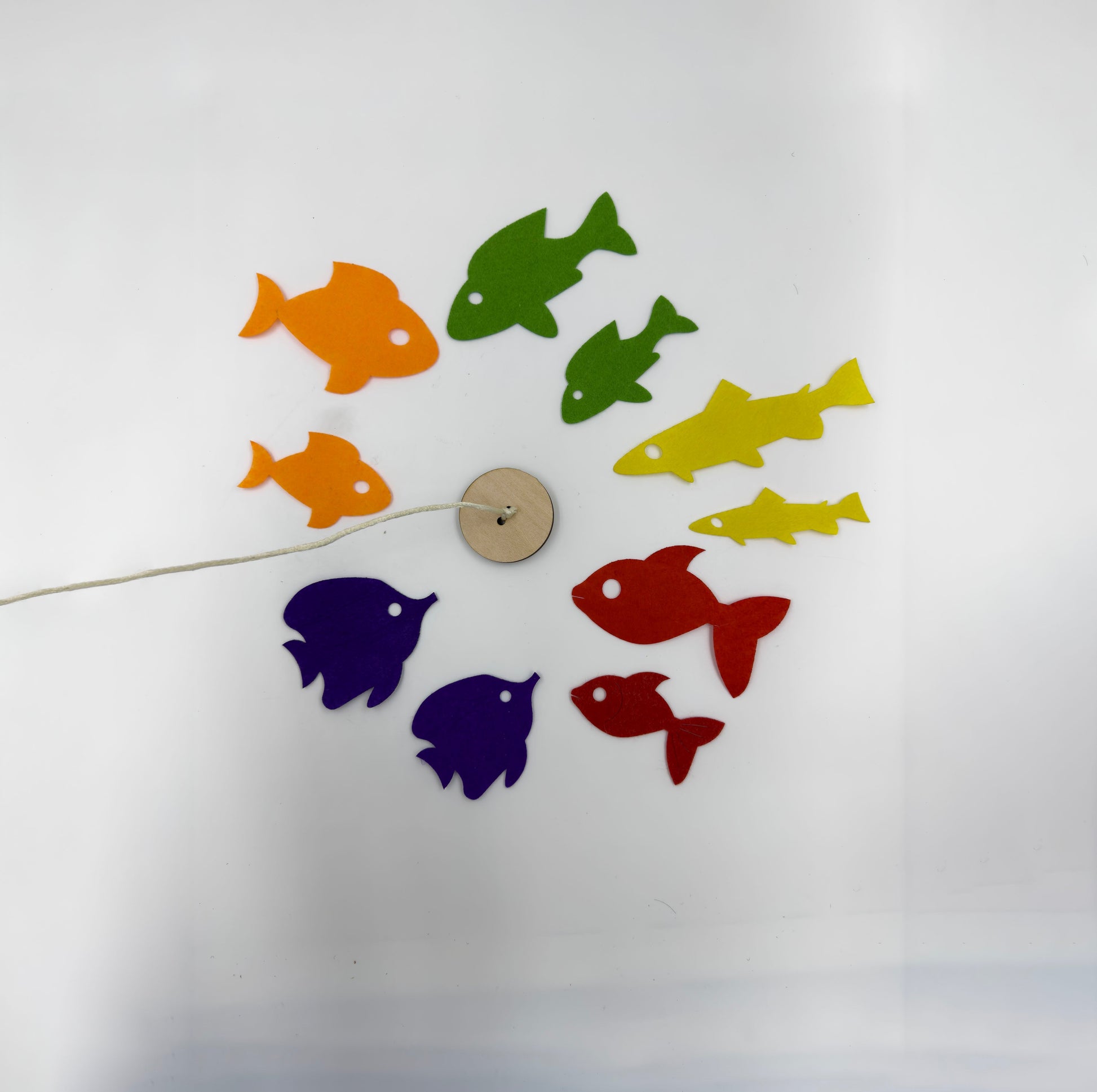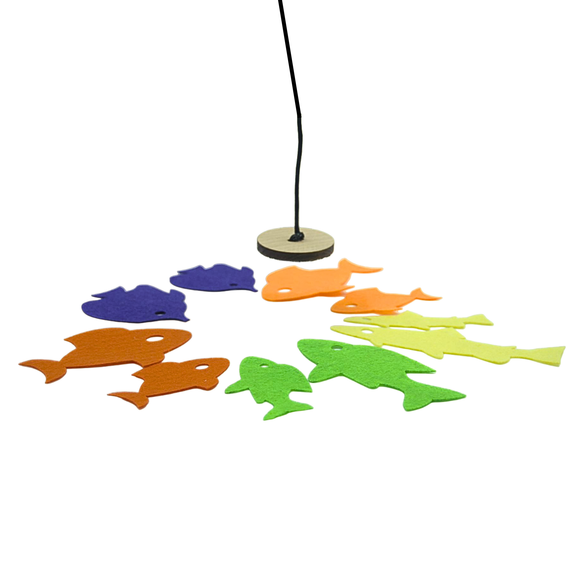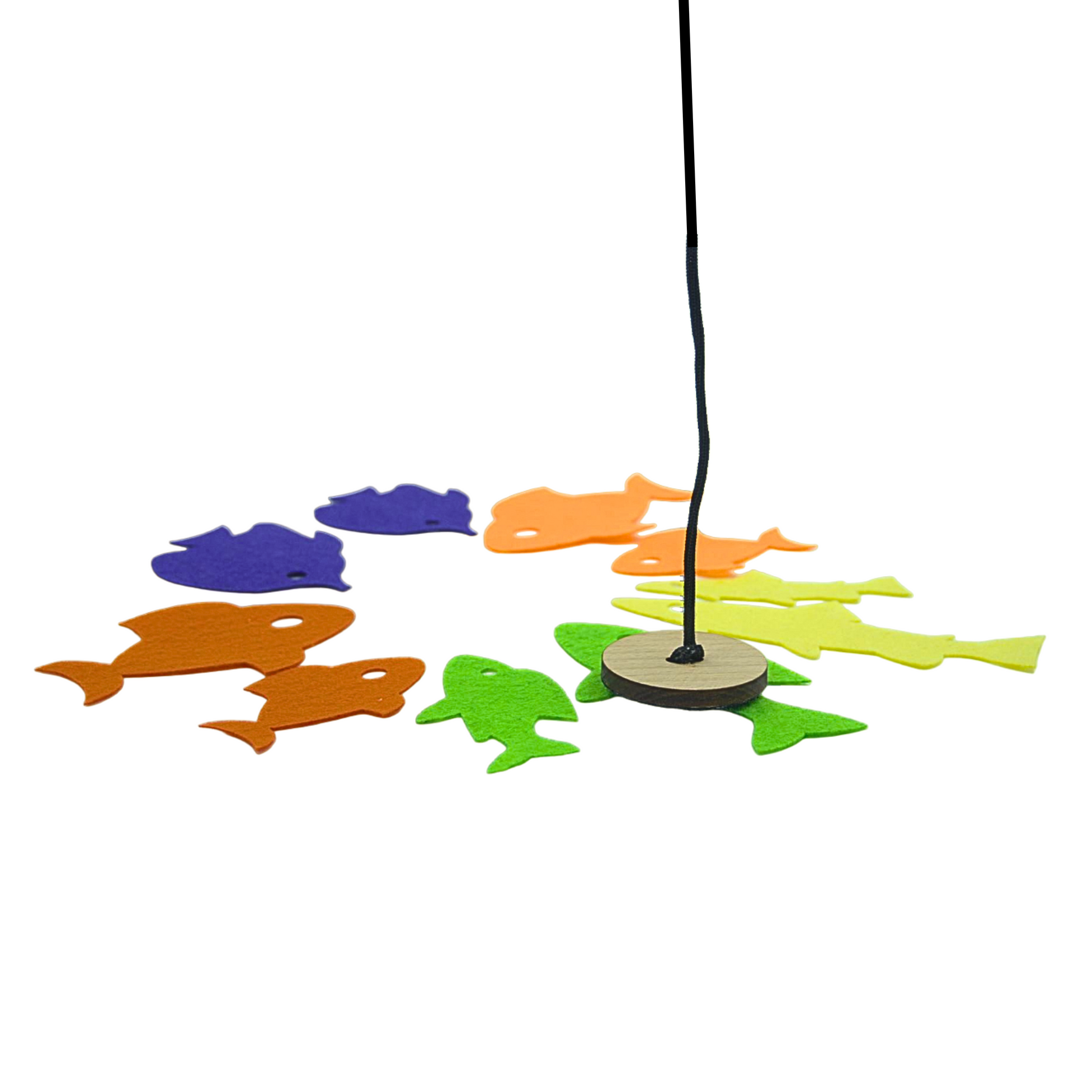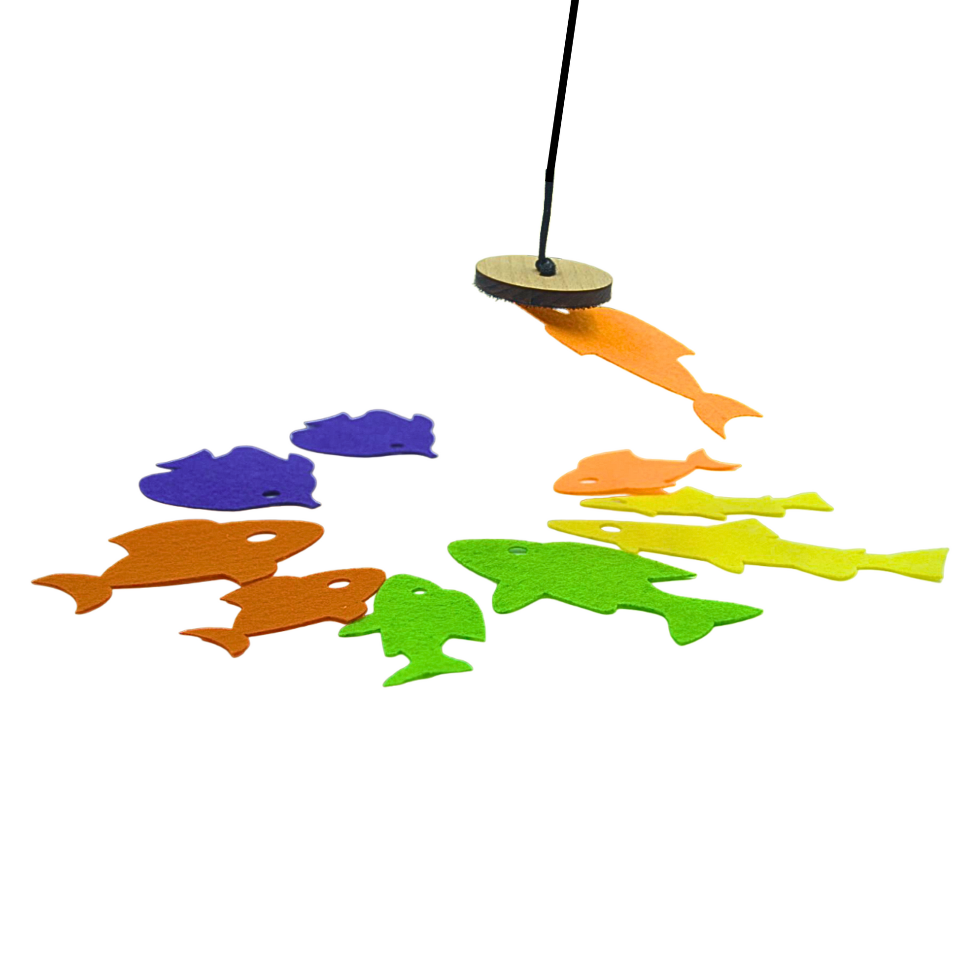 • Using the fishing rod to catch the felt fish can help improve fine motor skills by requiring children to use small hand muscles.