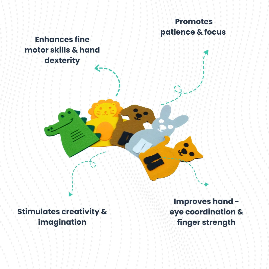 Made from soft fabric, explore storytime on your fingertips with these endless fun engaging 5 Finger puppet. This set includes a cat, dog, bunny, lion & a crocodile. Perfect pretend play activity for your little ones to boost imagination and narrative skills.