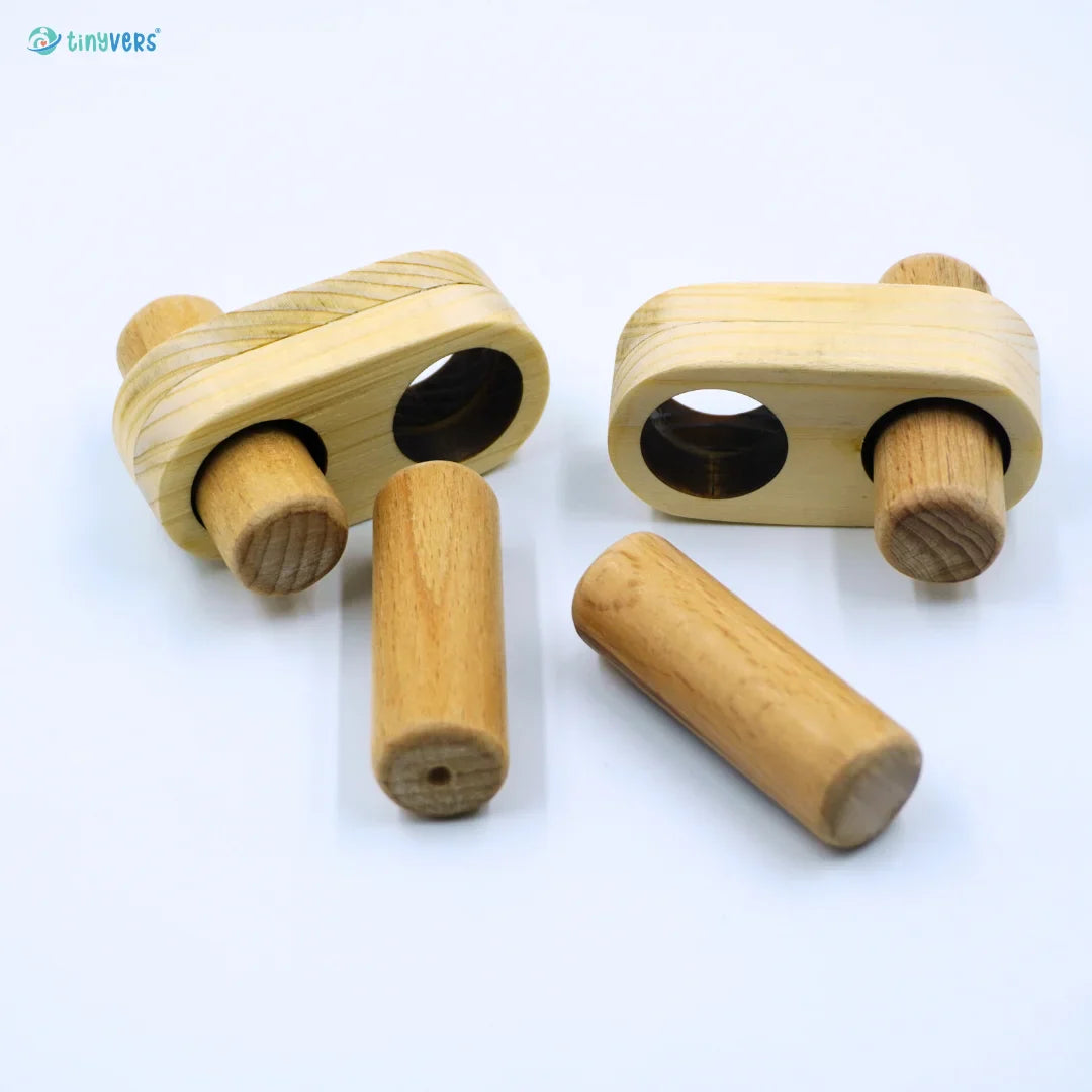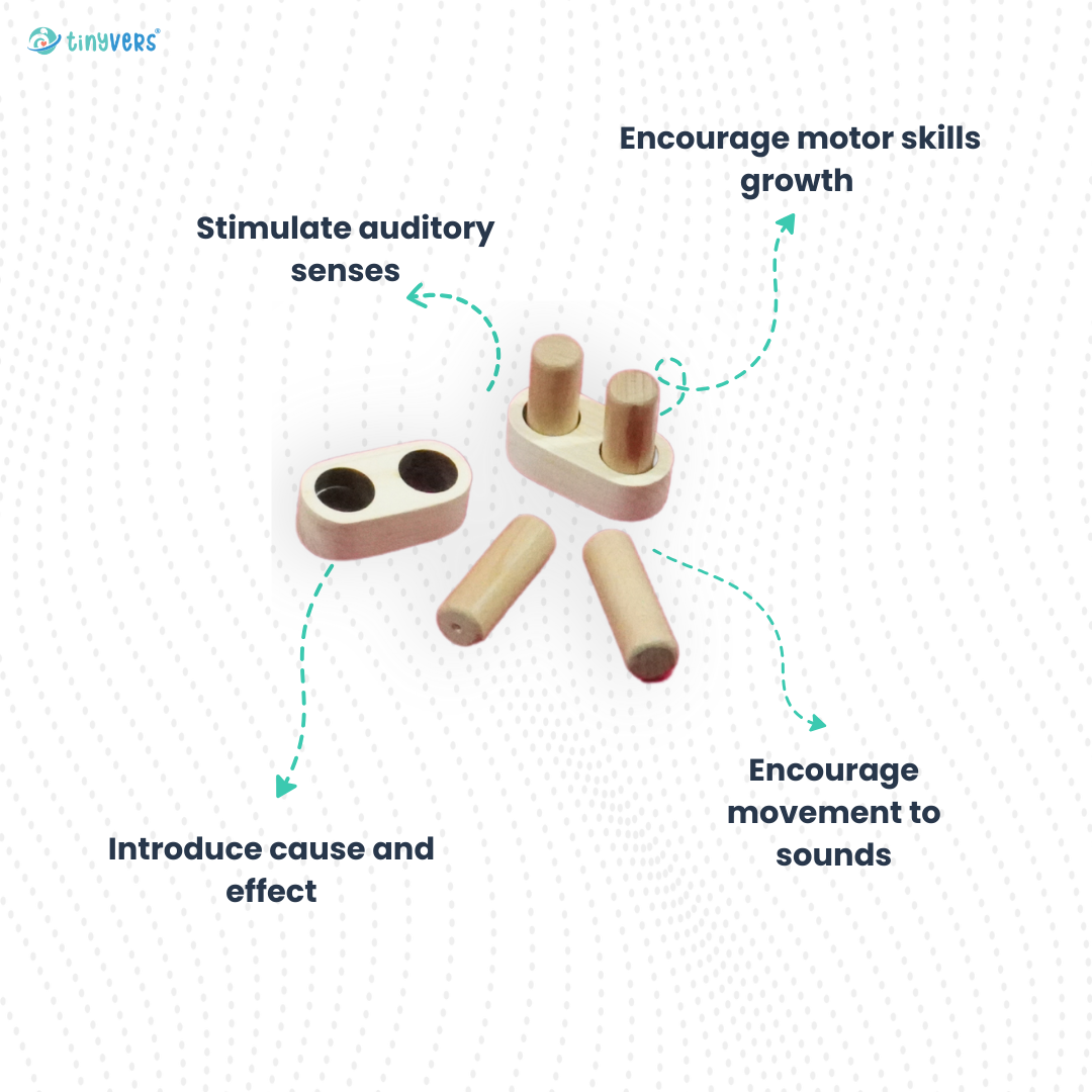 The Grip & play, crafted from high-quality natural wood, is a durable and sustainable toy that aids children in developing their pincer grip and hand-eye coordination. It comprises a wooden base with two small cylindrical hollow space. The objective of the puzzle is simple that is to insert the cylindrical knobs into the hollow part of the base.