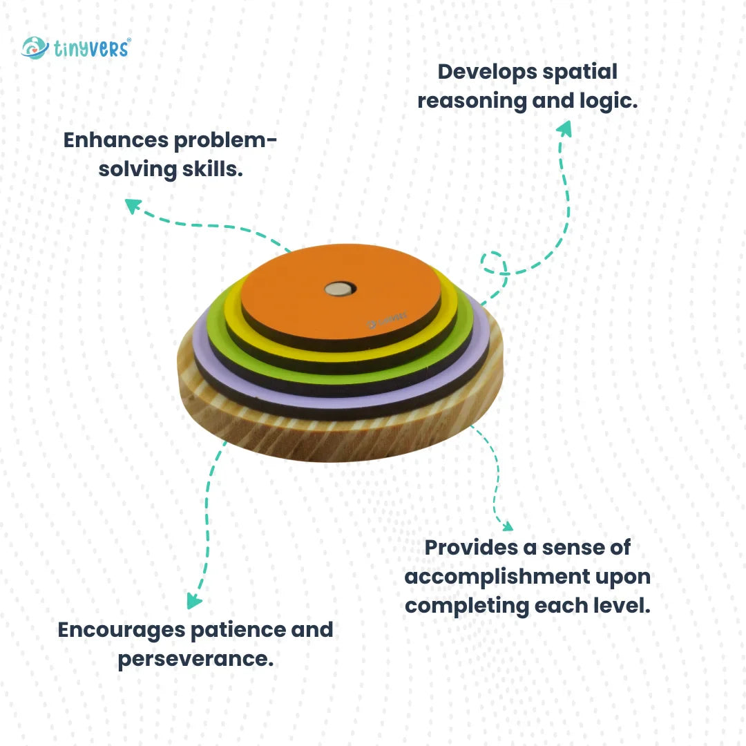 5. As you progress, increase the difficulty by selecting discs with more complex stacking patterns.