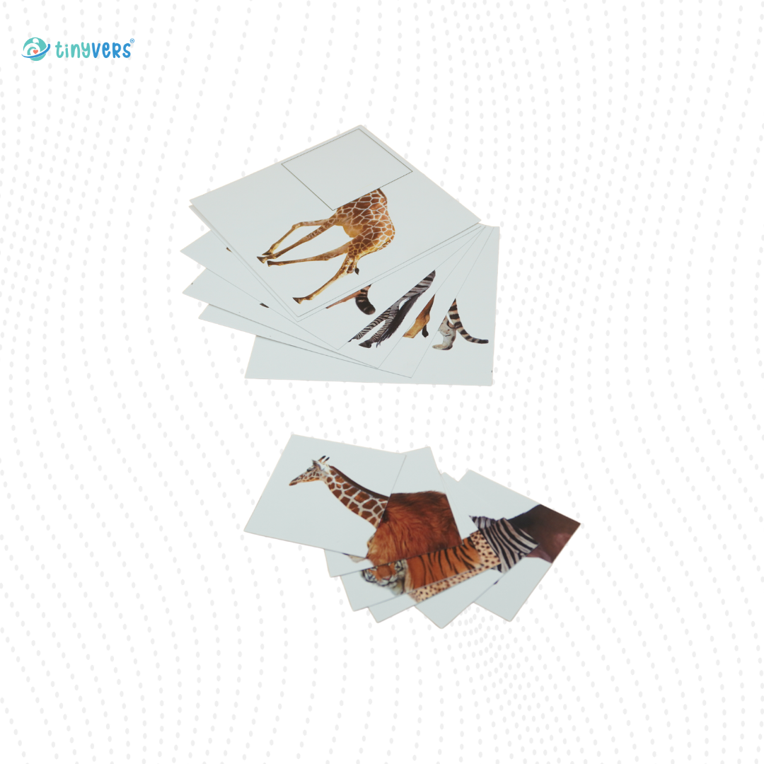 Boost your child's imagination and problem-solving skills with these animals-skin matching cards. The set includes six combination cards, each featuring a unique pattern. Children can dismantle each card and interconnect its parts with the other cards to create a new and exciting challenge. The objective is to find the correct face and assemble them according to their animal body to recreate the six individual animals.