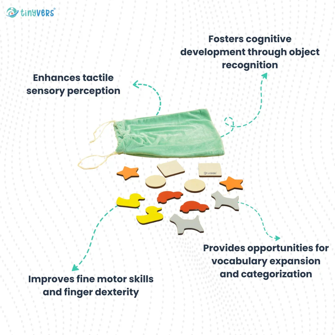 Explore the sense of touch and stimulate cognitive development with the Feel & Find Bag, fostering sensory exploration and object recognition through tactile discovery without looking at the object.