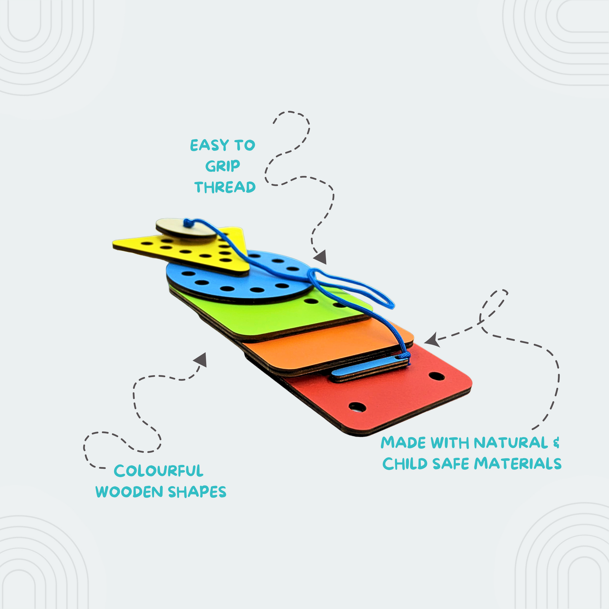 • The wooden shapes and colorful string provide opportunities for kids to learn about colors and patterns.