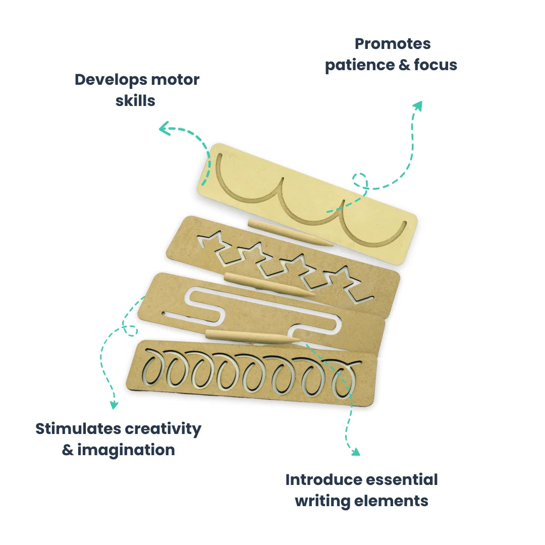 Explore the power of pre-writing skills development Toy and motor skills enhancement with our Wooden Line Tracing Stencil Board. Designed as a valuable Montessori learning resource, this set of 4 prewriting tracing tiles is perfect for young kids for early learning development and to start their writing journey.