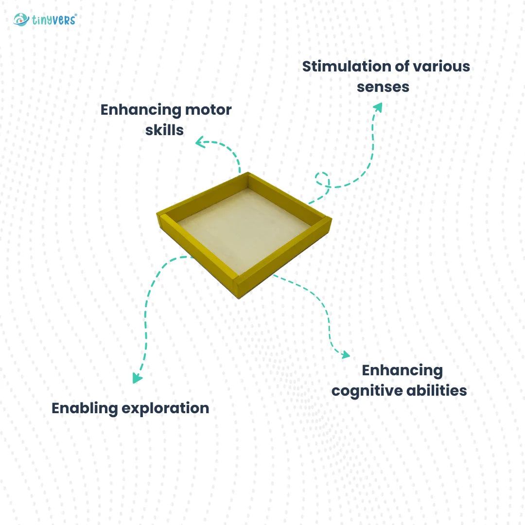 • Self-exploration and independent learning by freely exploring and experimenting with objects on the tray.