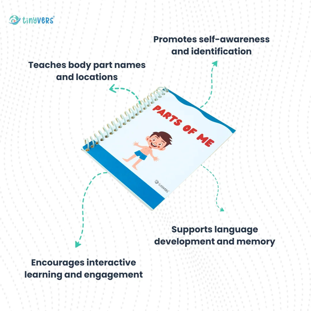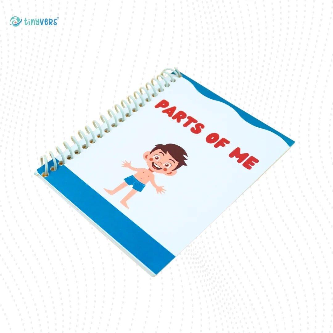 Help your child learn about their body with "Parts of Me Book." This book uses fun illustrations to help teach children the names and functions of different body parts, essential in increasing knowledge about the body and building vocabulary.