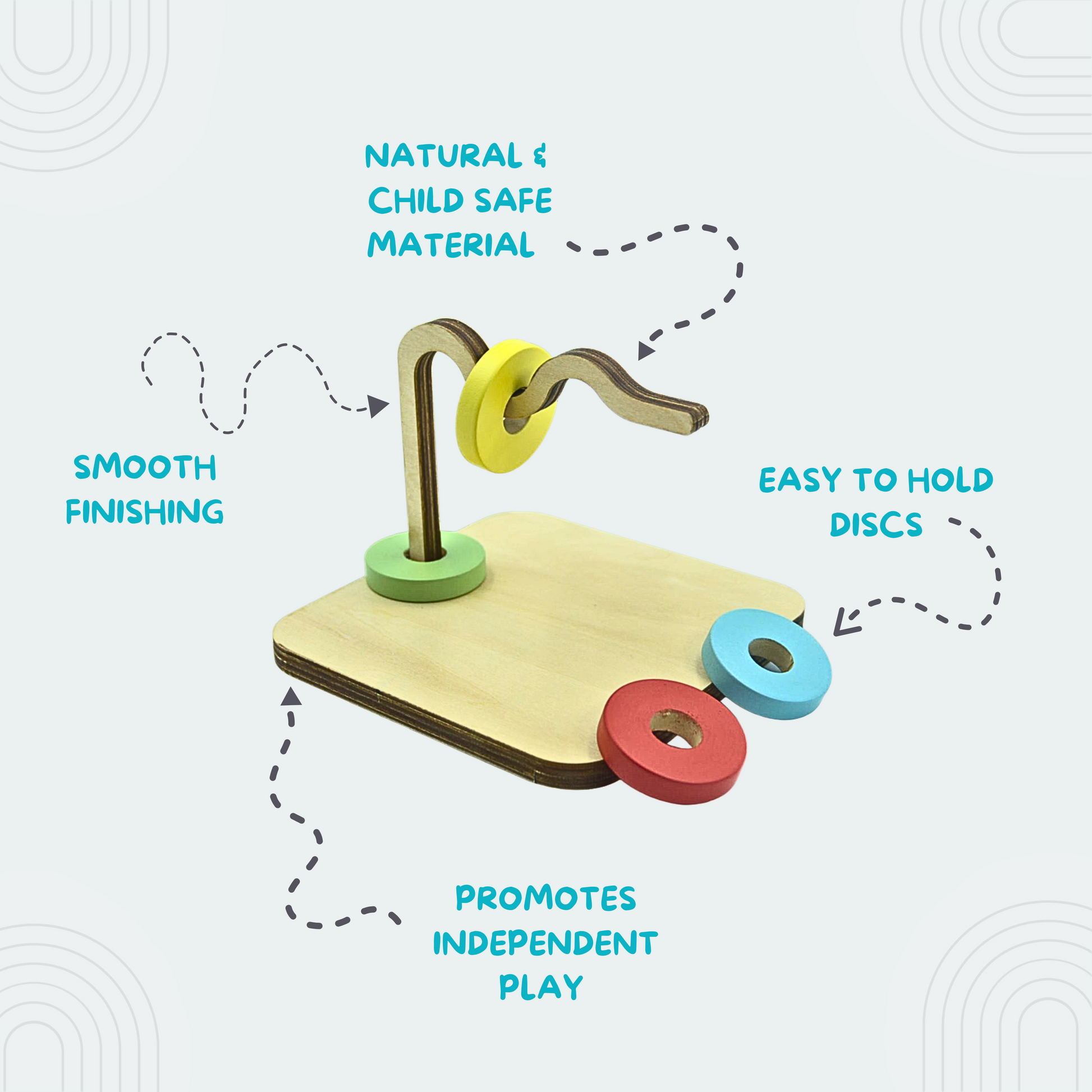 • Playing with the toy can help your child develop focus and concentration as they work to slide the discs along the dowel.