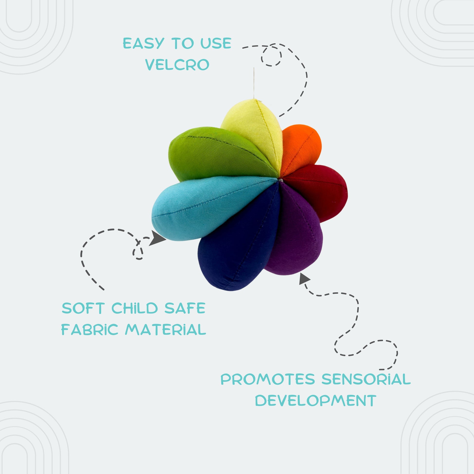 1. Encourage your child to explore the ball's vibrant colours and texture by allowing them to touch and feel it.