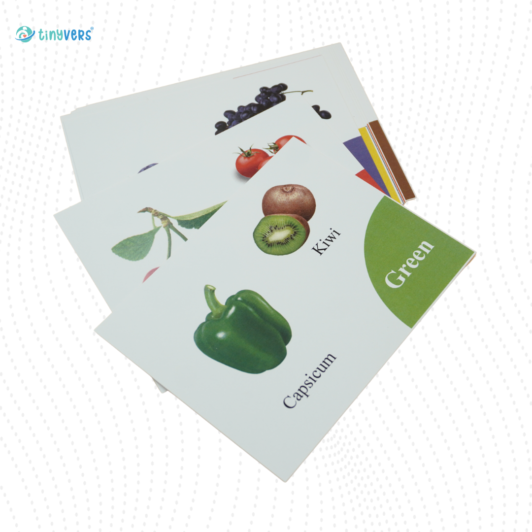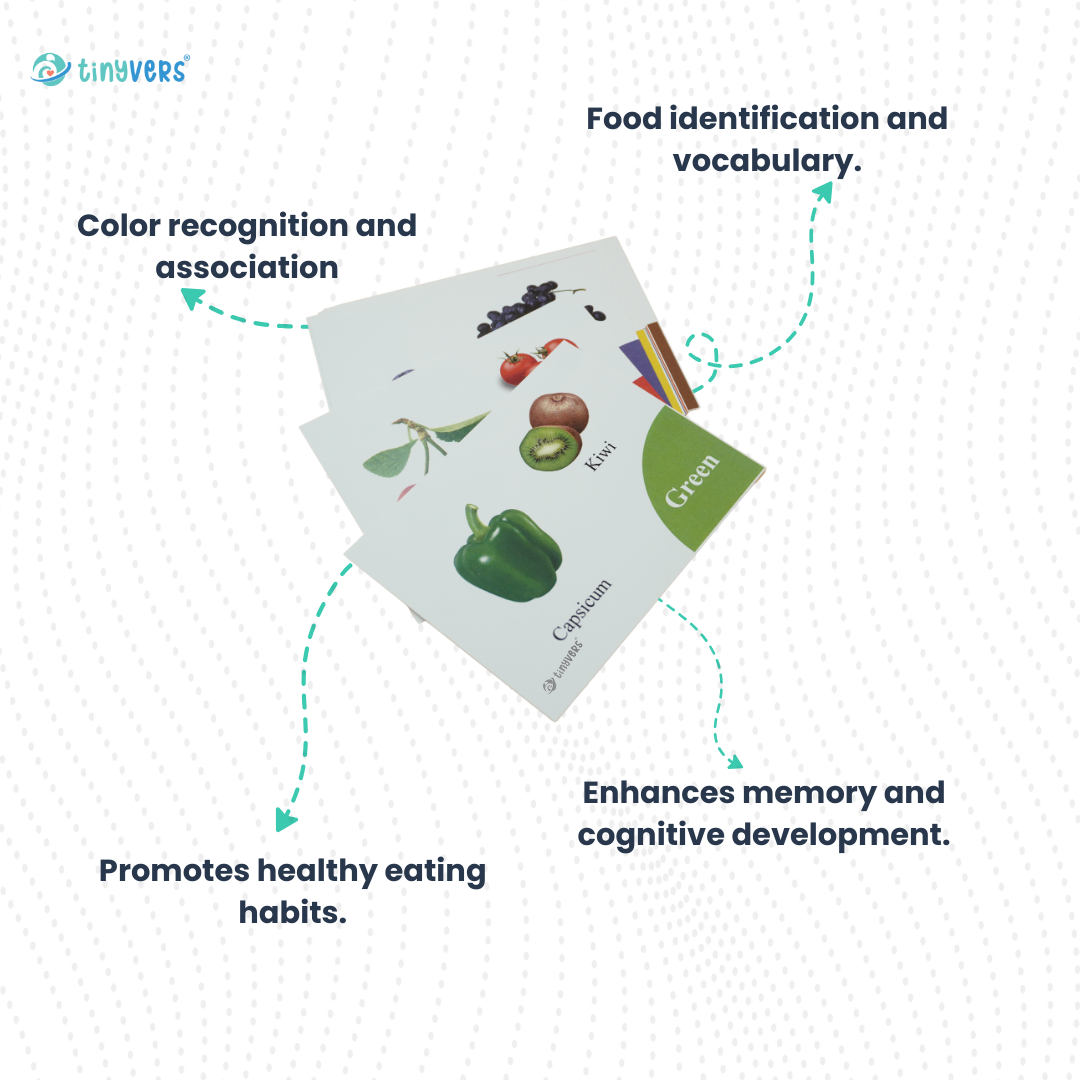 • Through the illustrations on the cards, they can learn to recognize different colors and food.