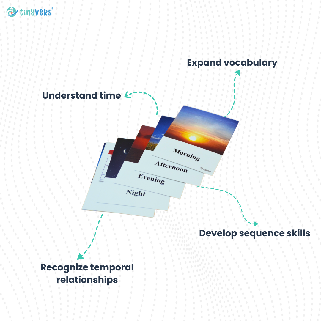 • The flashcards provide an opportunity for children to learn and practice new vocabulary related to time concept.