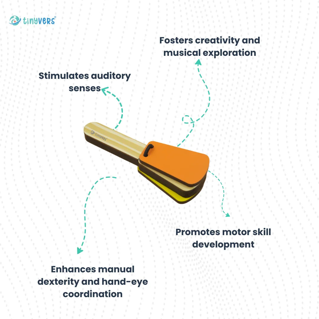 Introducing wooden castanet rattle , made from natural wood, non-toxic materials and smooth edges that are as gentle as a baby's touch. Tap, shake, create melodies of joy together to enhance fine motor skills, creativity and musical exploration!