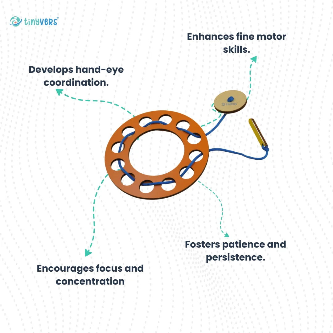 This wooden lacing ring with loops build fine motor skills through threading fun. Improves toddlers eye hand coordination and bimanual skills