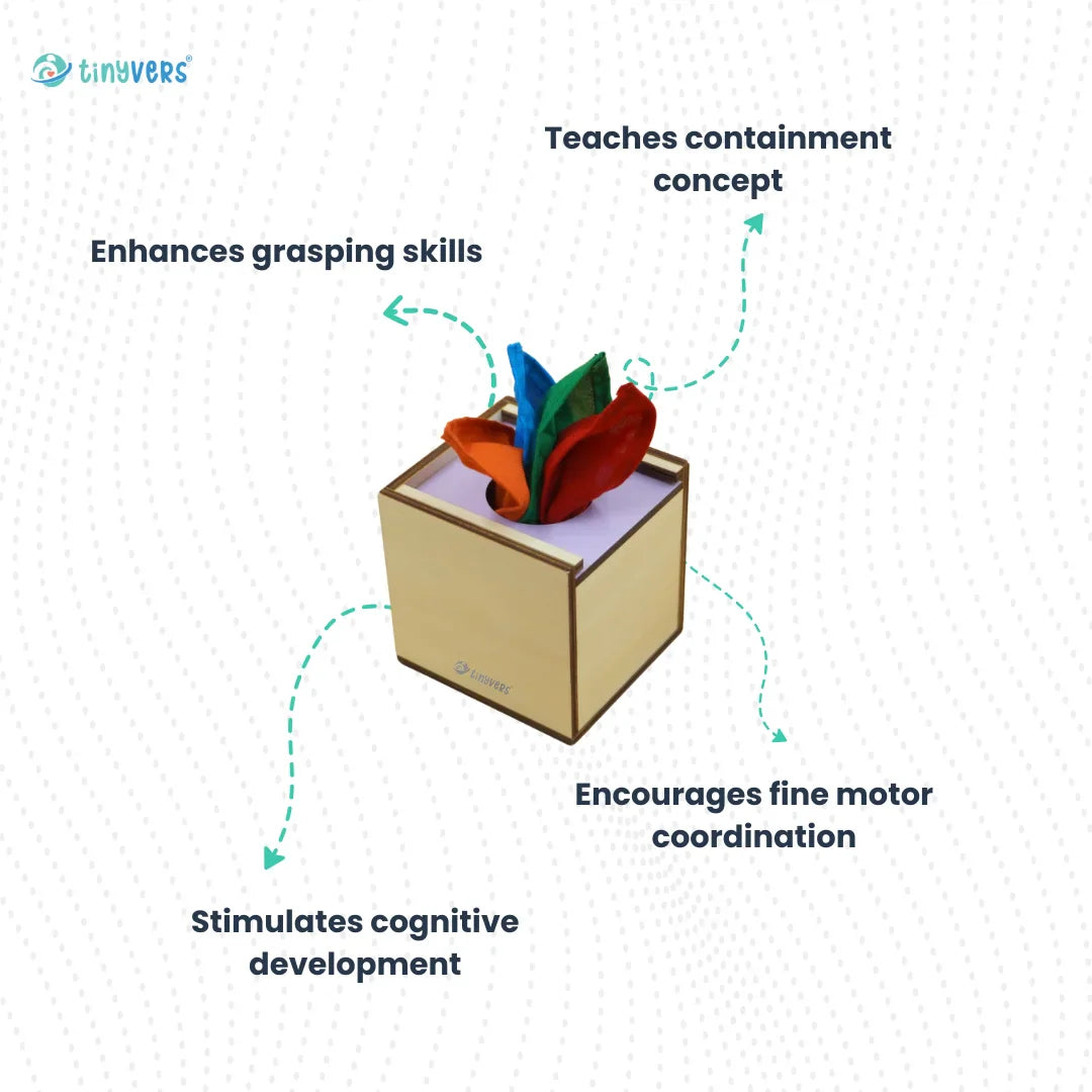 This Napkin Pull Box with colorful napkins encourages curiosity, problem solving skills, & enhances fine motor skills. The box is made up of wood and fabric that are baby safe & easy fit for your baby's hand hold & grasp.