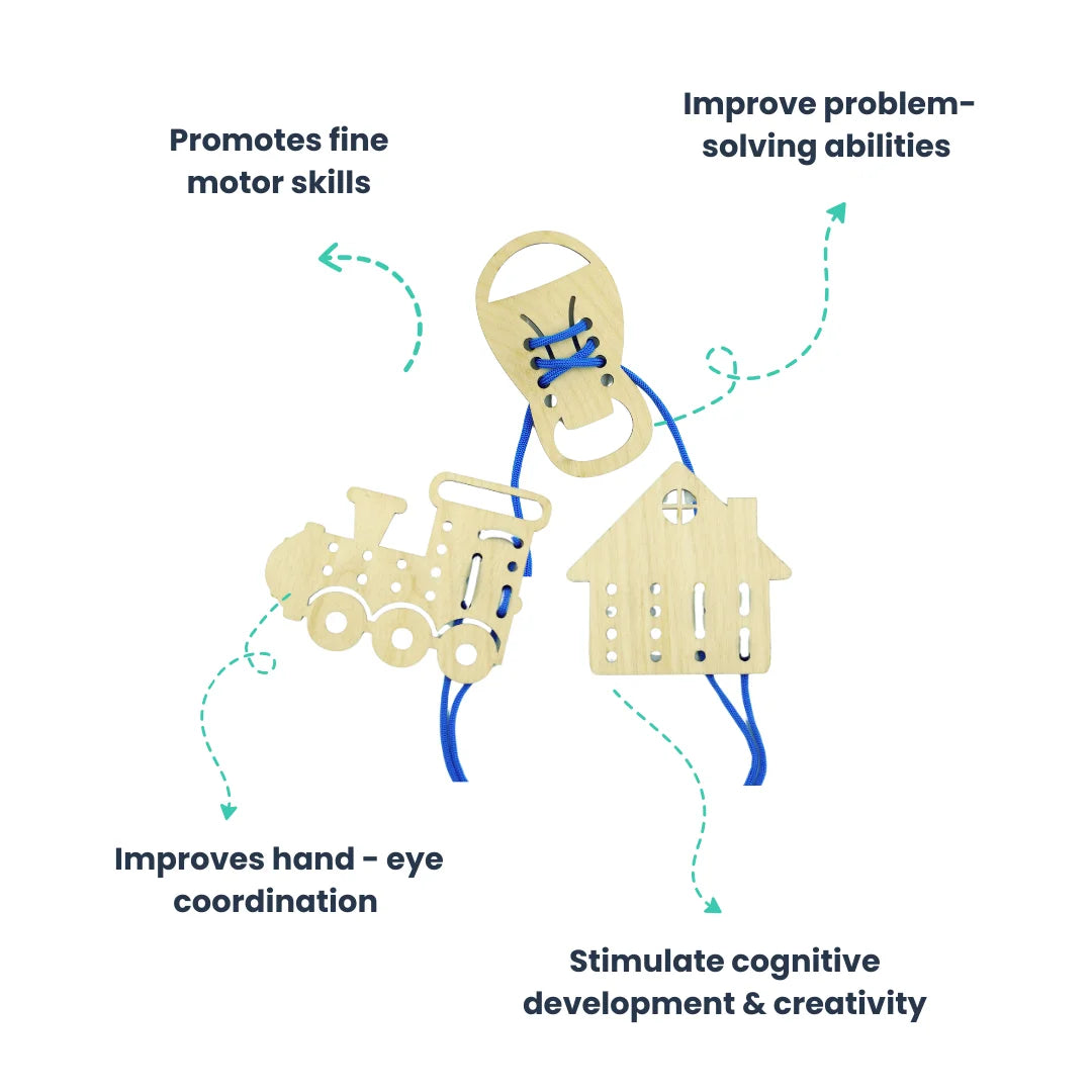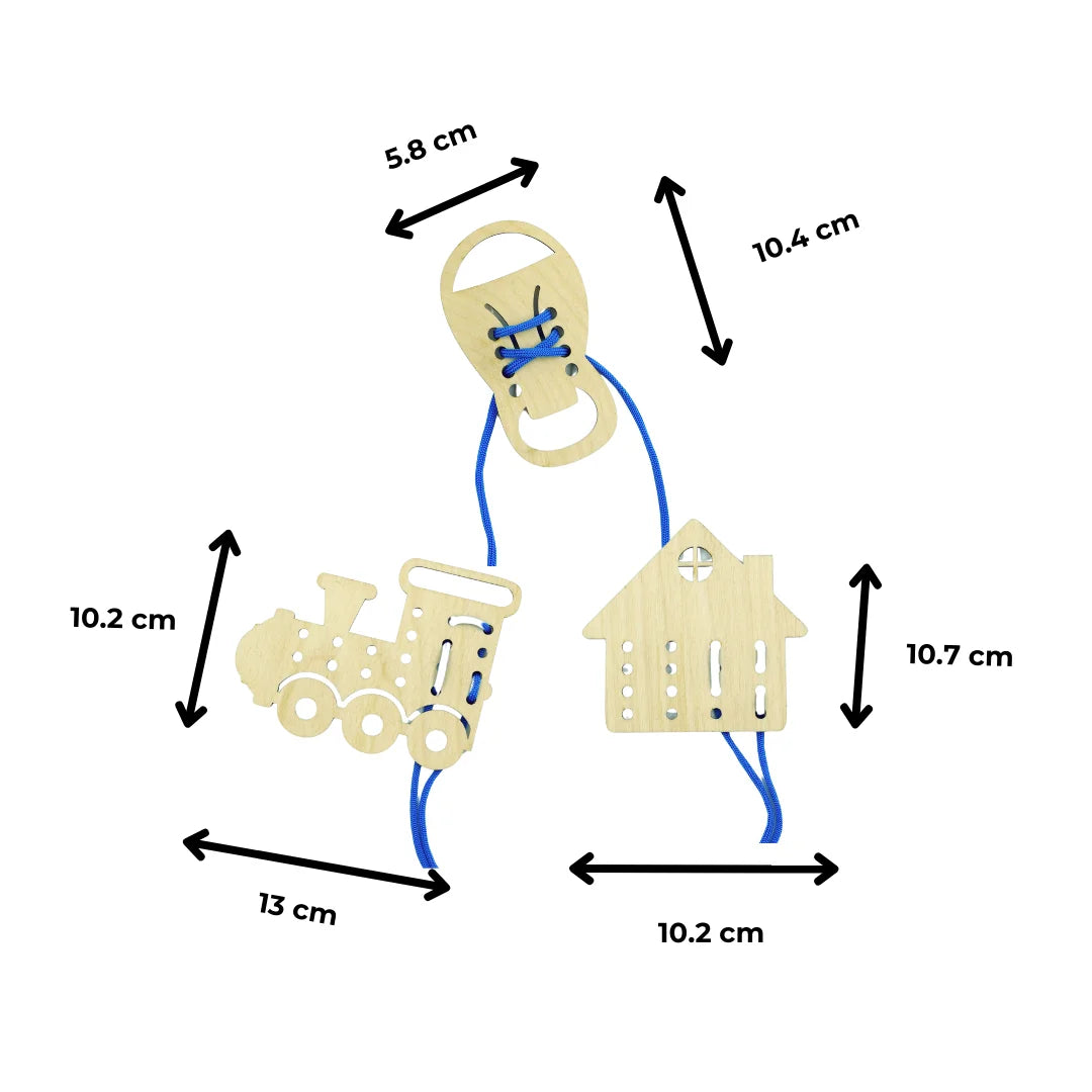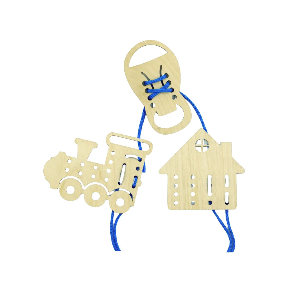 Introduce your child to the wonders of sensory development with the Wooden Object Lacing Set(Train,House,Shoe). This set includes 3 object cutouts and wooden needles with yarn, perfect for enhancing fine motor skills and hand-eye coordination. Ideal for kids aged 3 and up, it encourages creativity and sensory development through interactive play.
