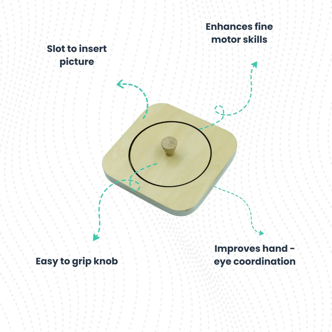 Designed for toddlers, this interactive photo puzzle offers versatile play options. With its sturdy construction, the game incorporates a wooden frame with an inscribed picture and a knob. Toddlers can enjoy engaging in a delightful peek-a-boo game or be encouraged to grasp and pick up the knob, fostering the development of their pincer grip. Moreover, the knob also doubles as a teether, providing soothing relief for teething toddlers.